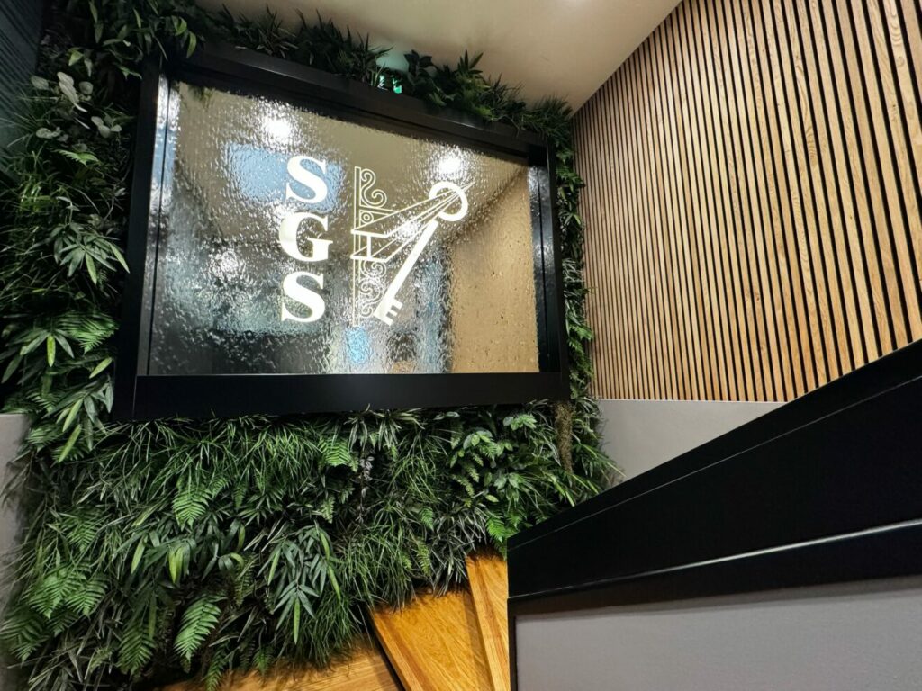 A custom-designed water wall with logo and greenery