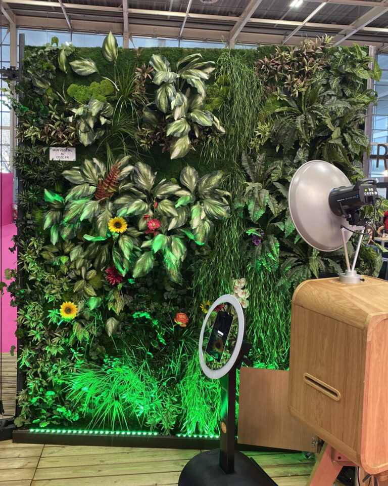 To meet this challenge, Odzo was asked to provide its full expertise by creating a custom green wall installation for the event. We proposed a rental green wall perfectly adapted to the space reserved for the exhibition, measuring 3 meters high and 3 meters wide, and designed entirely according to the client’s requirements: style, finish, color palette and plant composition.