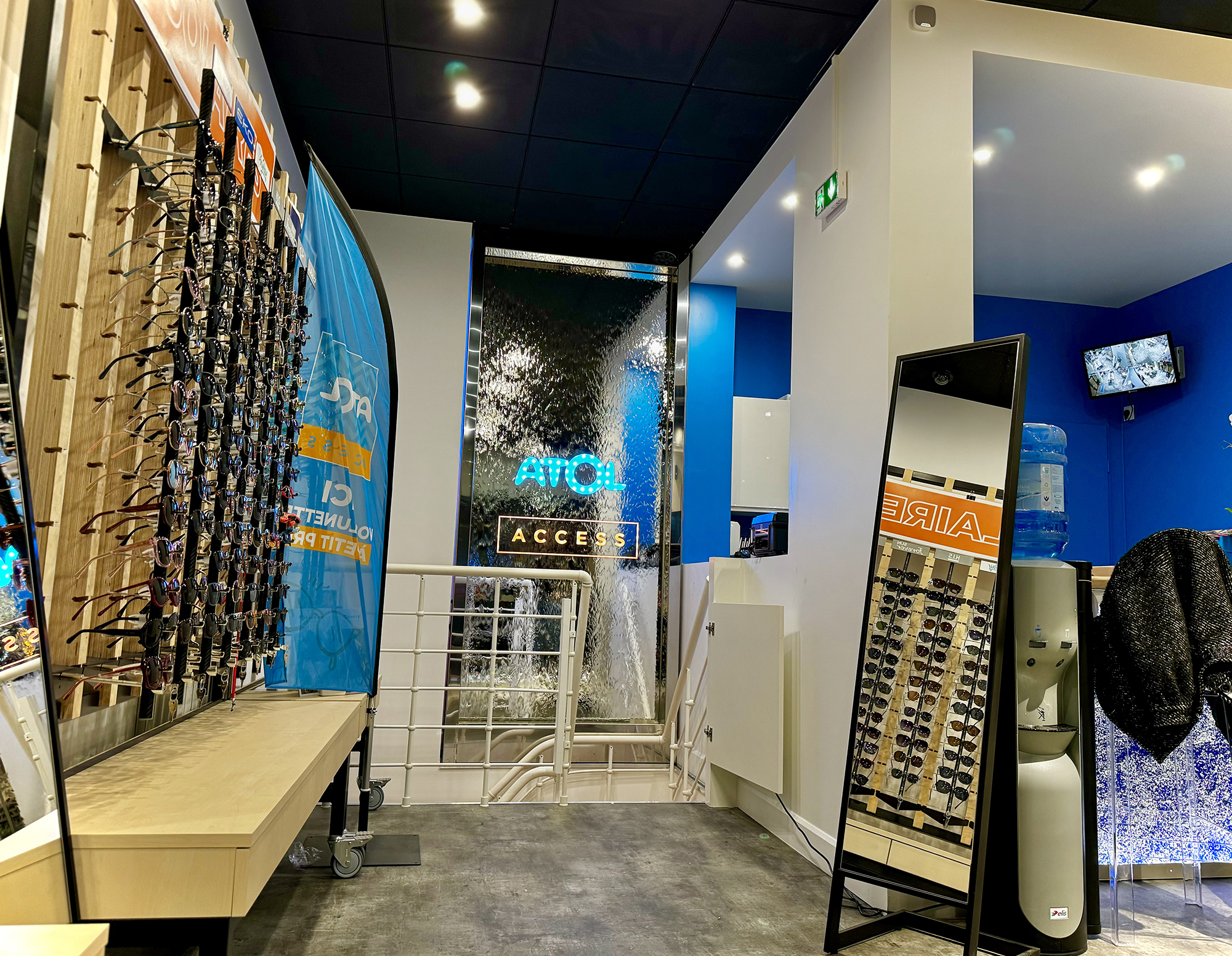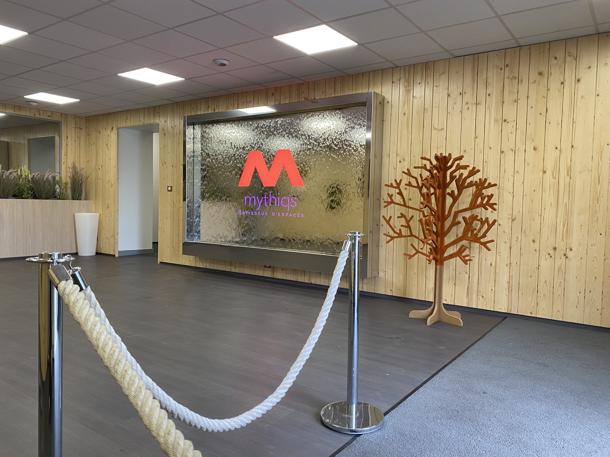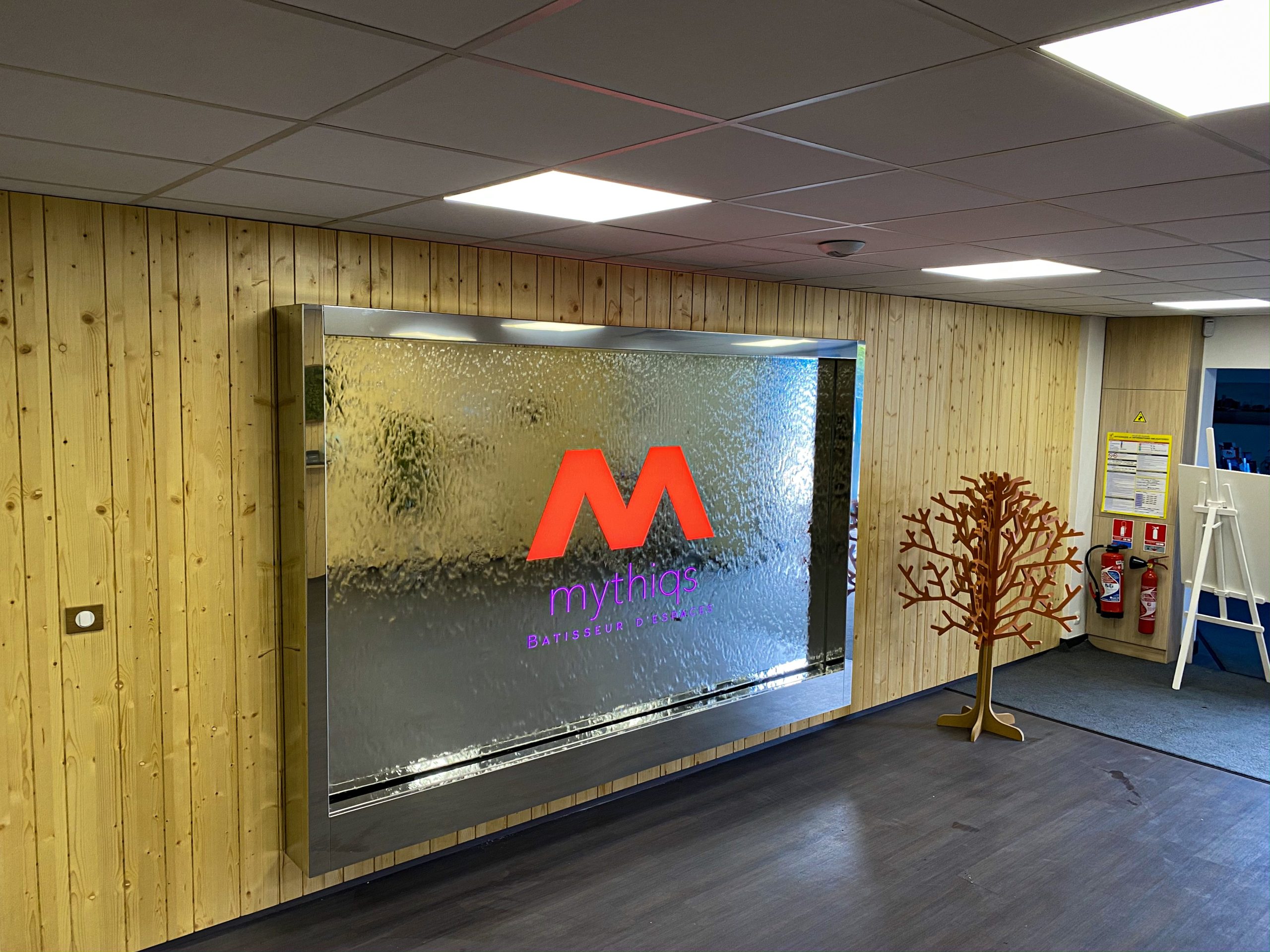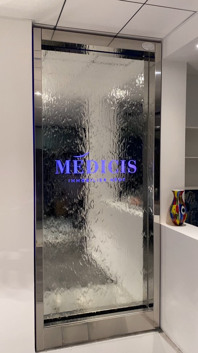 A mirror water wall with sandblasting helps you increase visibility and brand recognition by drawing attention to your stand, storefront, or display area.