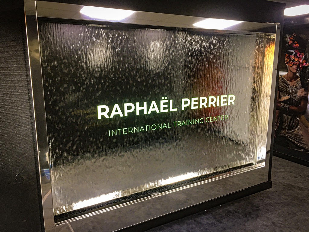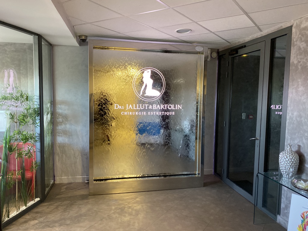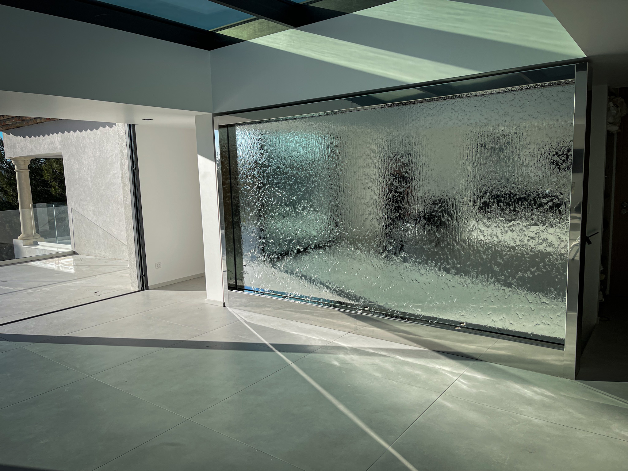 Once the design has been created through mirror sandblasting, the sandblasted glass panel is installed as a water wall. The flowing surface remains untouched, creating a flawless waterfall effect. To enhance this unique creation, colored LED lighting can be added, making the pattern or logo appear in a very elegant and contemporary way.