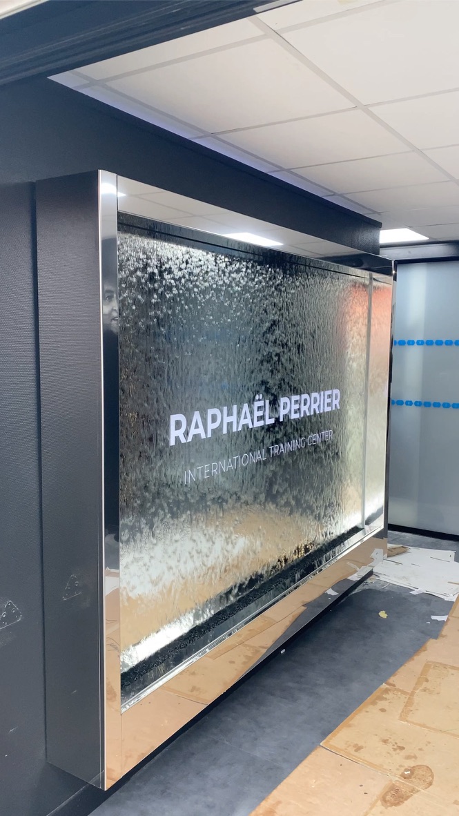 Une fois le dessin réalisé par sablage sur miroir, la pièce en verre sablé est installée comme un mur d’eau. La surface d’écoulement reste intacte pour un effet cascade parfait. Pour sublimer la création unique, un jeu d’éclairage LED couleur peut être ajouté. Le motif ou le logo apparaît de manière très élégante et moderne. Le mur d’eau miroir avec sablage vous permet de gagner en visibilité, en notoriété en attirant tous les regard sur votre stand, vitrine, etc ..
